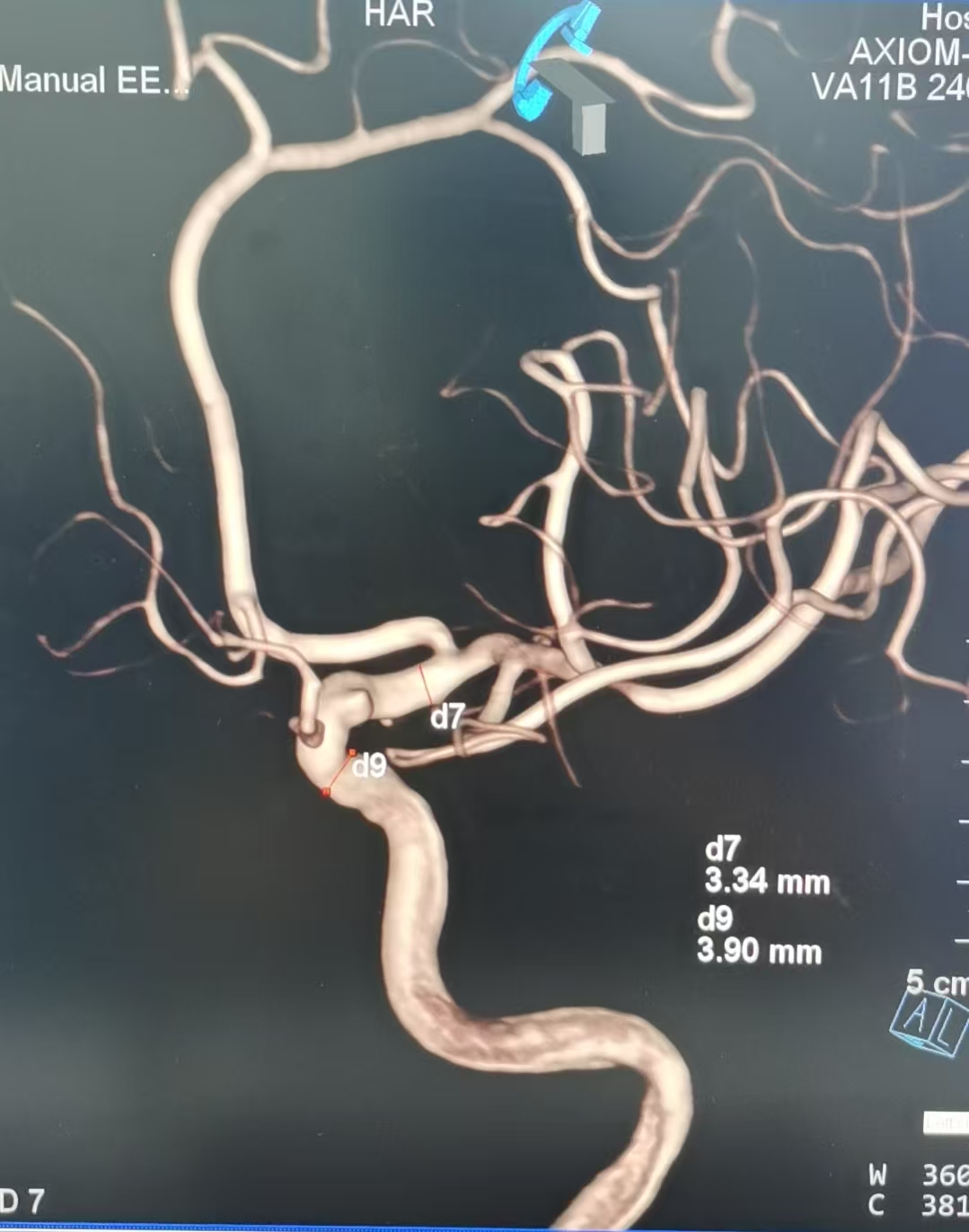 手术团队采用先进的Seldinger技术,精准穿刺患者右侧远端桡动脉并建立微创通道。术中造影清晰显示,患者左侧颈内动脉眼段存在一枚大小约4×2mm、瘤颈较宽且形态不规则的动脉瘤。